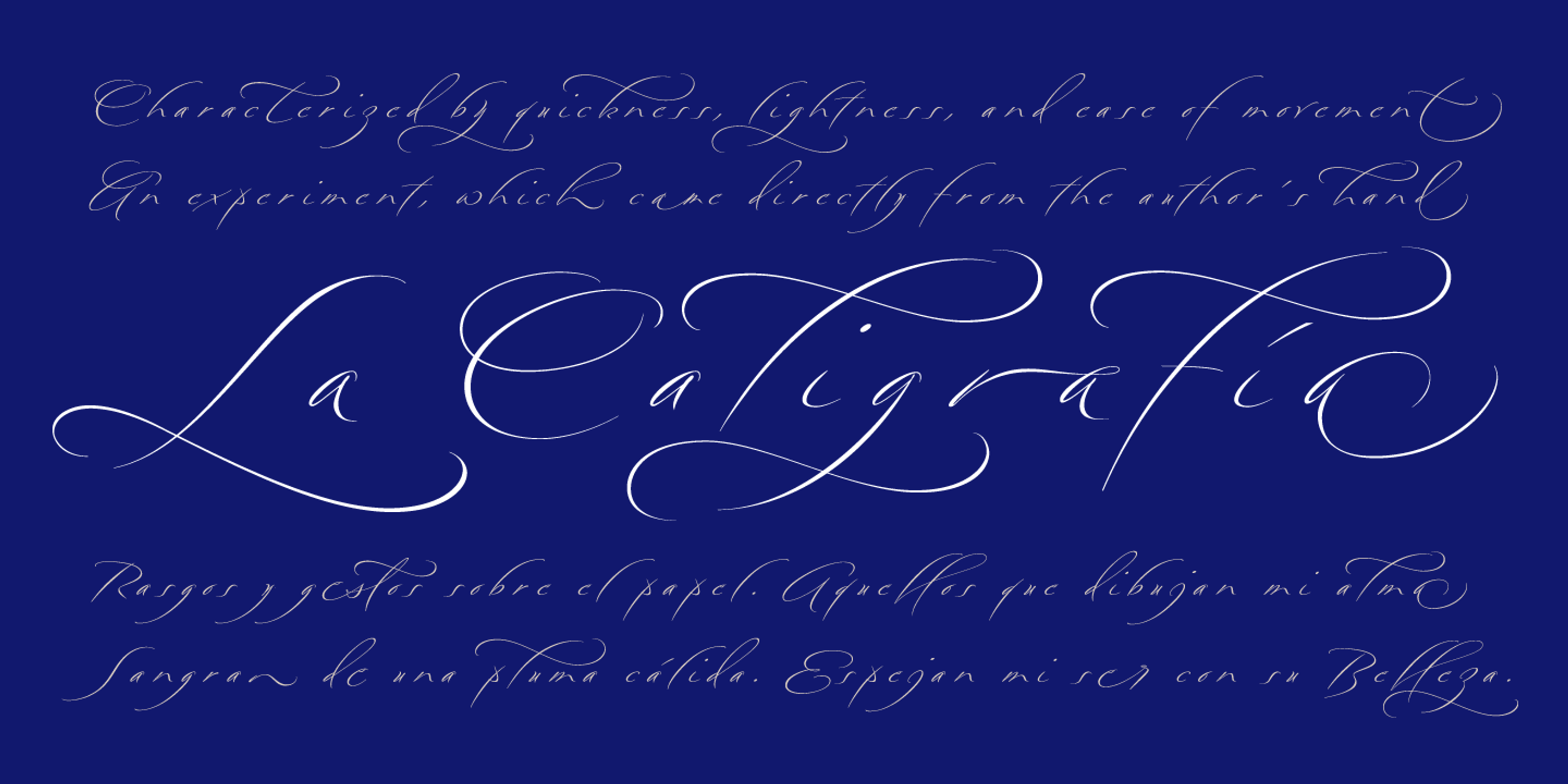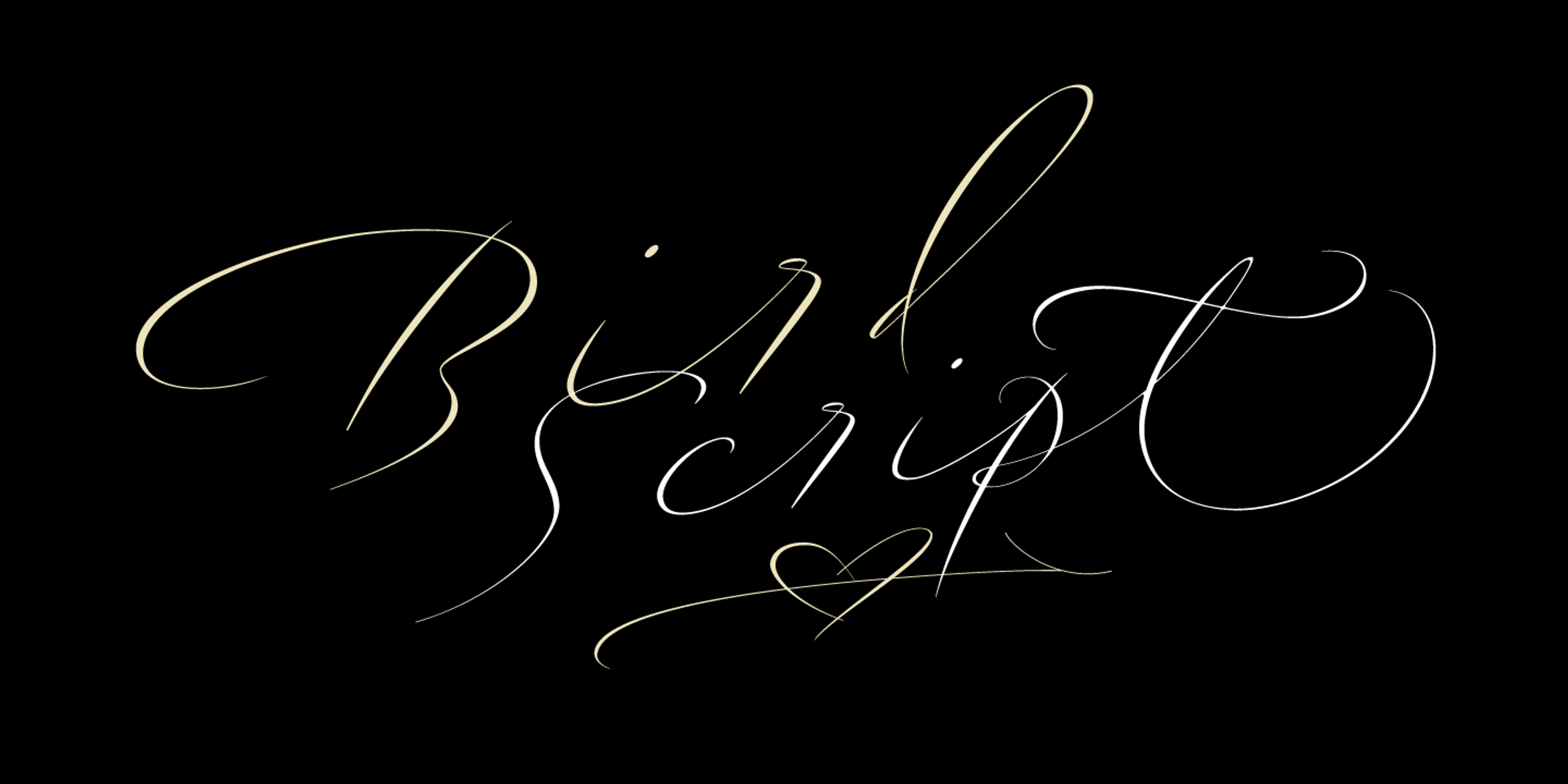 Characterized by quickness, lightness, and ease of movement, Bird Script challenges many aspects of type design with panaché. It dances between the formal rules of typography and the artistic look of calligraphy. Bird Script is filled with the energy of gestural calligraphy, where every letter is never the same. When manipulating the pen, the letterer seeks the beauty of the differences and the grace of a confident execution. Choose Bird Script and let your words come alive.