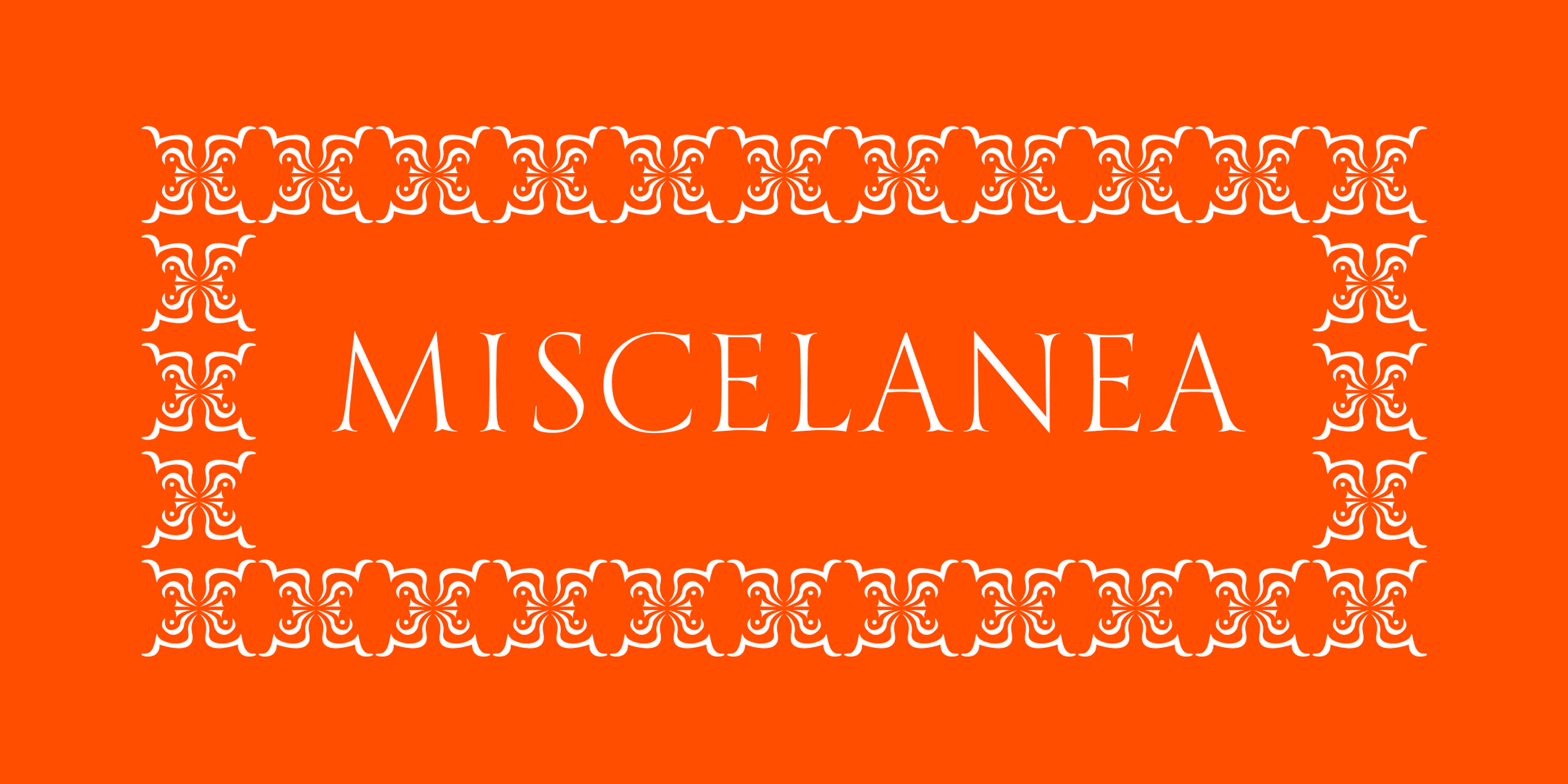 Miscelanea is an ornamental dingbat collection designed to catch the eye. Each glyph is a flourish of symmetry and movement — perfect for building patterns, creating borders to frame text, or adding decorative accents. Whether used individually or repeated to form striking motifs or backgrounds, these shapes bring rhythm and richness to packaging, posters, textiles, and editorial spreads. A playful yet polished way to dress up your design work.