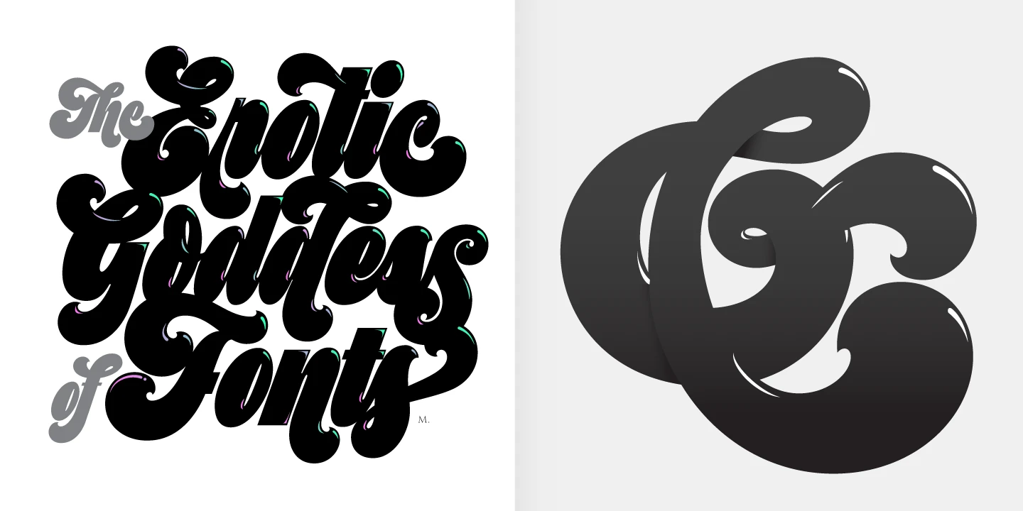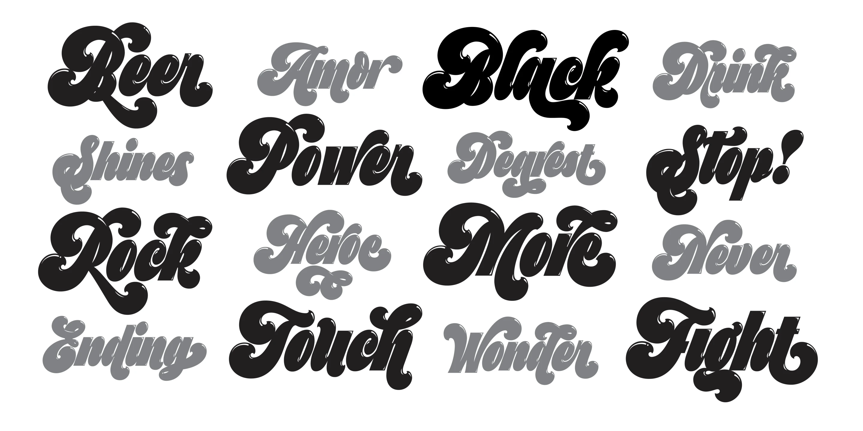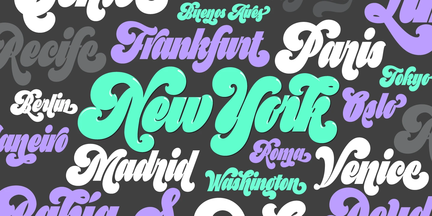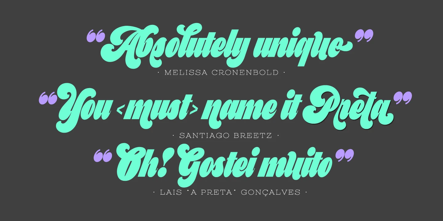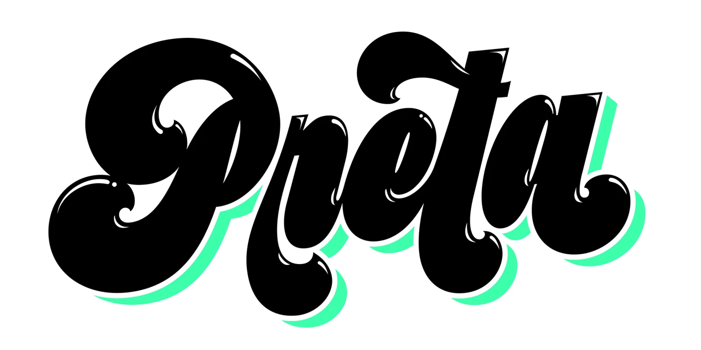 Preta is a bold and juicy maximalist script full of swagger, built for display use. Inspired by a striking mix of copperplate calligraphy and early Art Nouveau lettering, its dense forms and tight rhythm deliver a powerful visual punch. Preta Capitals, monolinear and modern, offer the perfect typographic foil. With playful swashes, layered styles, and sunlit highlights, Preta is ideal for modern brands, expressive logos, movie titles, oversized headlines, and eye-catching posters.