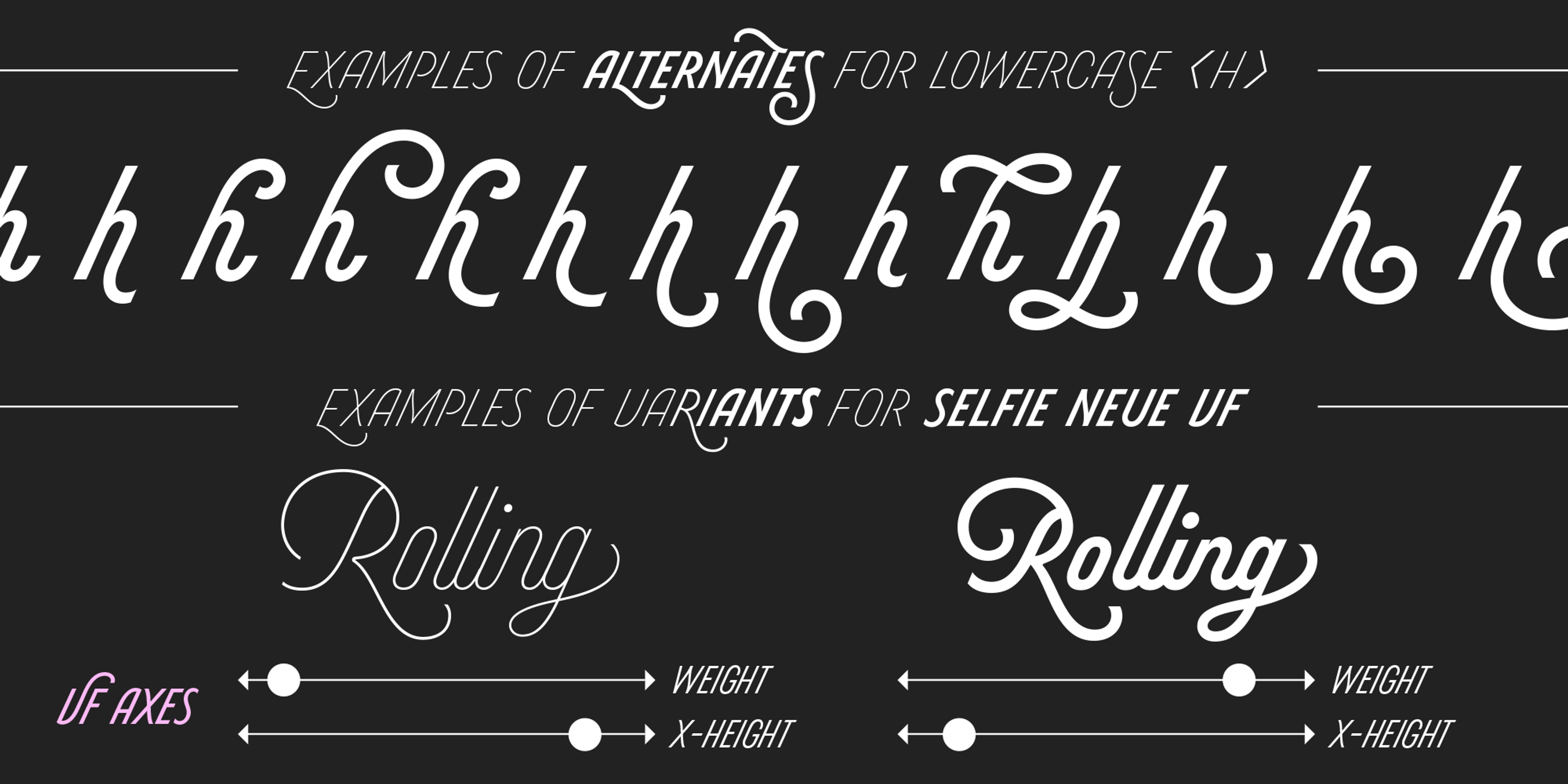 Selfie Neue Sharp is a vibrant monoline script blending elegant Spencerian logic and energetic Buenos Aires neon. While the diverse ligatures and swashes give it personality and rhythm, the Caps companion font and the variable axes for weight and x-height offer endless typographic flexibility. Whether you’re developing brands, book covers, restaurants, festivals, packaging, or digital content, Selfie Neue is expressive, stylish, and impossible to ignore. Dingbats designed by Melissa Cronenbold.